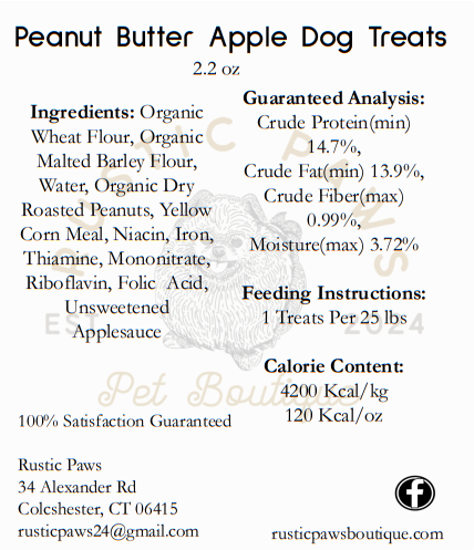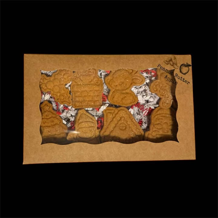 8 Festive peanut butter and apple dog cookies in holiday packaging. Perfect for spreading seasonal cheer to your furry friend!